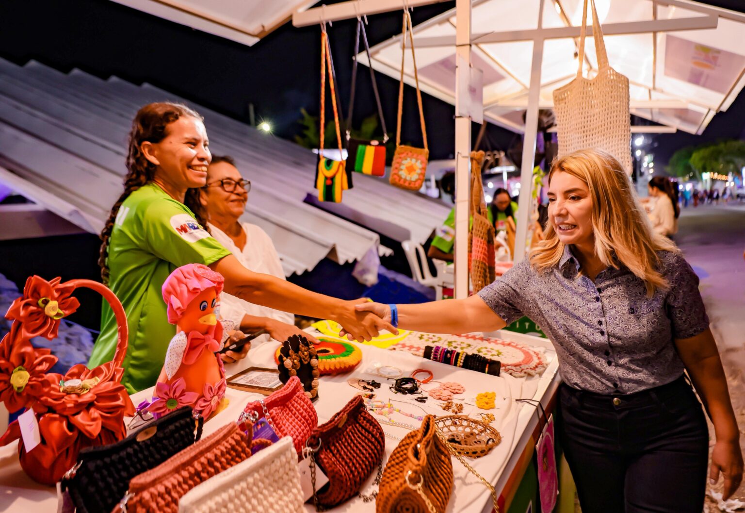 – Iracema Vale cumprimenta uma das expositoras durante visita aos estandes da Expoema