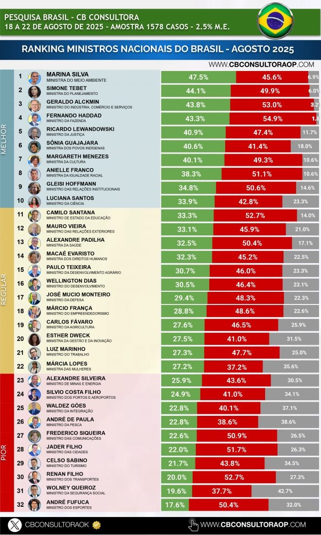 Uma pesquisa da CB Consultoria Opinión Pública, da Argentina, aponta que os ministros mais populares do governo Lula (PT) são Marina Silva (Rede), do Meio Ambiente, Simone Tebet (MDB), do Planejamento, e Geraldo Alckm.