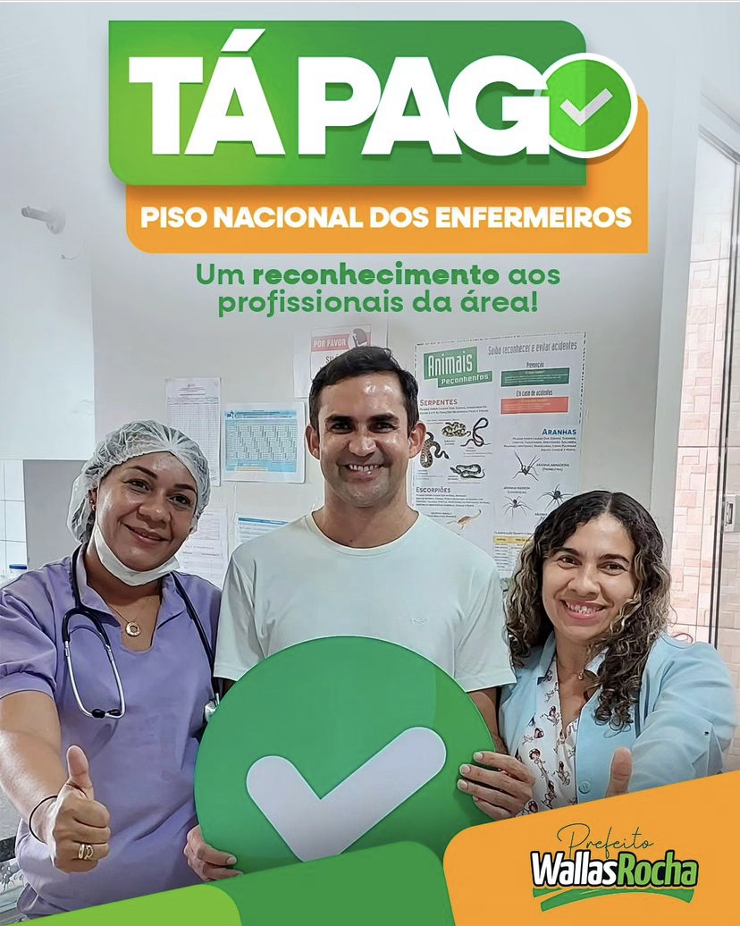 O prefeito Wallas Rocha, conclui nesta terça-feira, 19,  o pagamento da complementação do piso nacional para os enfermeiros do município.